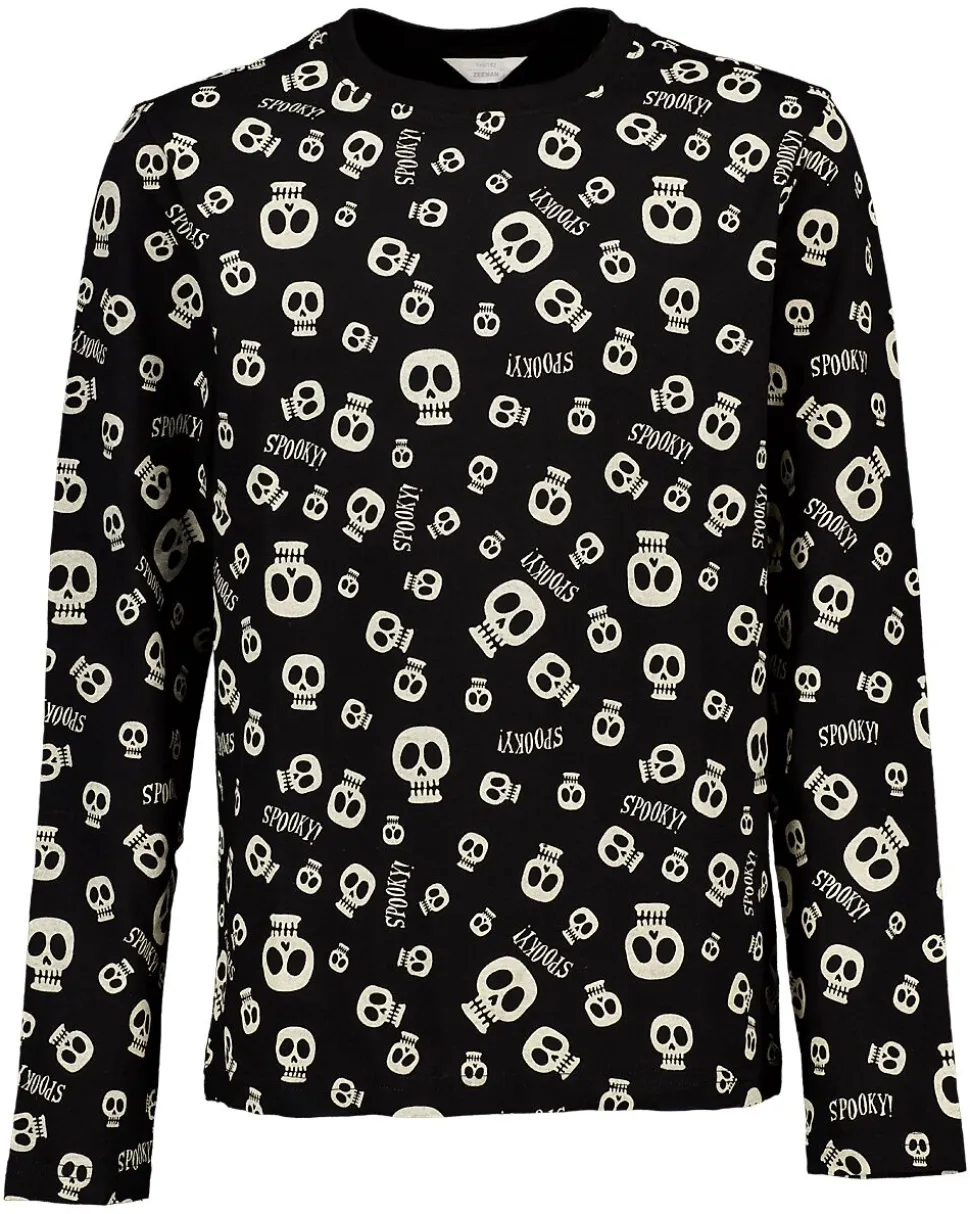 Ce t-shirt noir unisexe pour enfants arbore un imprimé accrocheur de têtes de mort blanches et de textes sur toute la surface. Les manches longues et l’encolure ronde offrent un confort supplémentaire. Confectionné en jersey simple, il est doux et souple au toucher. Son motif ludique en fait un choix idéal pour les enfants qui aiment un look audacieux.