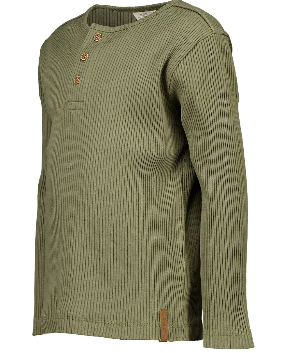 Ce t-shirt pour garçon de couleur verte a une structure côtelée et des manches longues. Grâce à l’encolure ronde avec trois boutons, le t-shirt est facile à enfiler et à enlever. Le tissu côtelé est doux et souple, ce qui permet une bonne liberté de mouvement. Sa couleur unie facilite l’association avec d’autres vêtements.