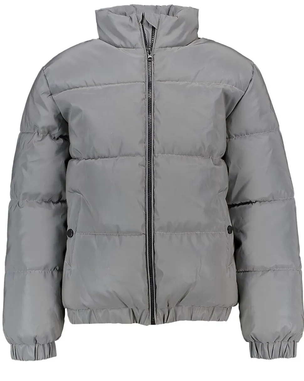 Cette veste argentée pour garçons et filles est fabriquée en 100% polyester. Elle a des coutures horizontales et un col montant, qui protègent bien du froid. Elle s’enfile et s’enlève facilement grâce à la fermeture éclair sur le devant. Les bords élastiques aux manches et en bas permettent à la veste de bien rester en place, ce qui laisse moins de prise au vent.
