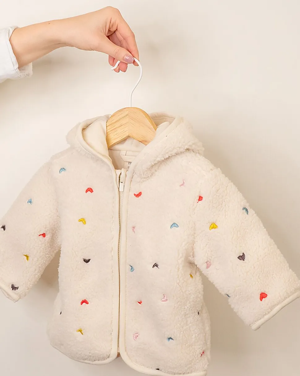 Cette veste de bébé beige à motif de cœurs a une capuche et se ferme devant avec une fermeture éclair, ce qui permet de l’enfiler et de l’enlever facilement. Grâce aux manches longues et à la coupe souple, votre bébé reste confortable et au chaud. Les couleurs douces se combinent facilement avec d’autres vêtements.
